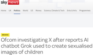 Shock news that the regulator has launched a formal investigation, and that a new law is being introduced, after the AI tool of ‘X’, Grok, was used to create sexualised imagery of women and children, highlight our decision NOT to use the social media site for The Eye’s stories as it (and its right wing owner Elon Musk) is so controversial.